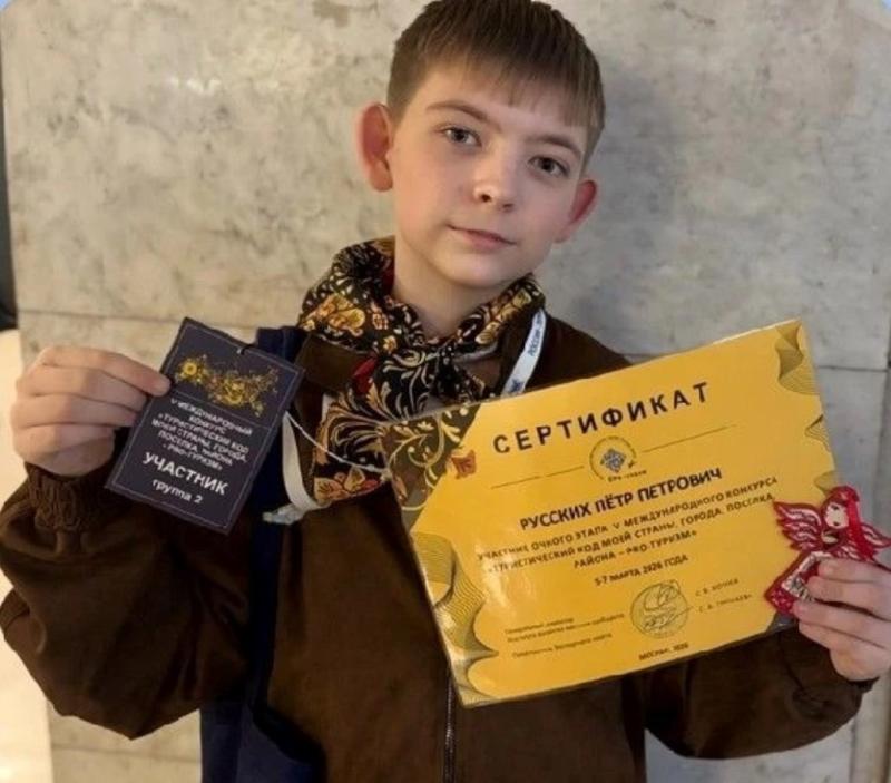 Ученик 6А класса поимской школы Пётр Русских успешно прошёл заочный этап и участвовал в очном этапе V международного конкурса Туристический код моей страны, города, посёлка, района про туризм, который состоялся в Москве. На мероприятии,